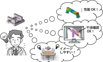 3DCADを使用することにより、設計検討からプレゼン説明、製造検討まで、一元的に行うことができ、業務の省力化が見込めます。